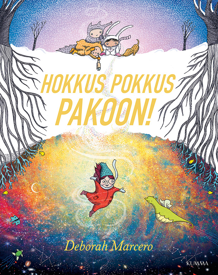 Hokkus pokkus pakoon! on kauniin mielikuvituksekas kuvakirja sisarussuhteista ja siitä, miten ihania ja vaikeita ne voivat olla — ja siitä, miten leikki, mielikuvitus ja yhteistyö tuovat yhteen riitaisimmatkin pukarit.